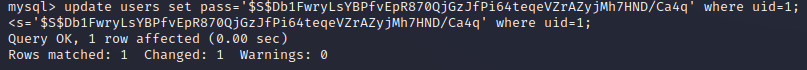 update users set pass='$S$Db1FwryLsYBPfvEpR870QjGzJfPi64teqeVZrAZyjMh7HND/Ca4q' where uid=1; |