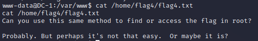 看一下 /home/flag4 的文件,尝试 cat flag4/flag4.txt,拿到 flag4,发现提示我们将权限提升到 root